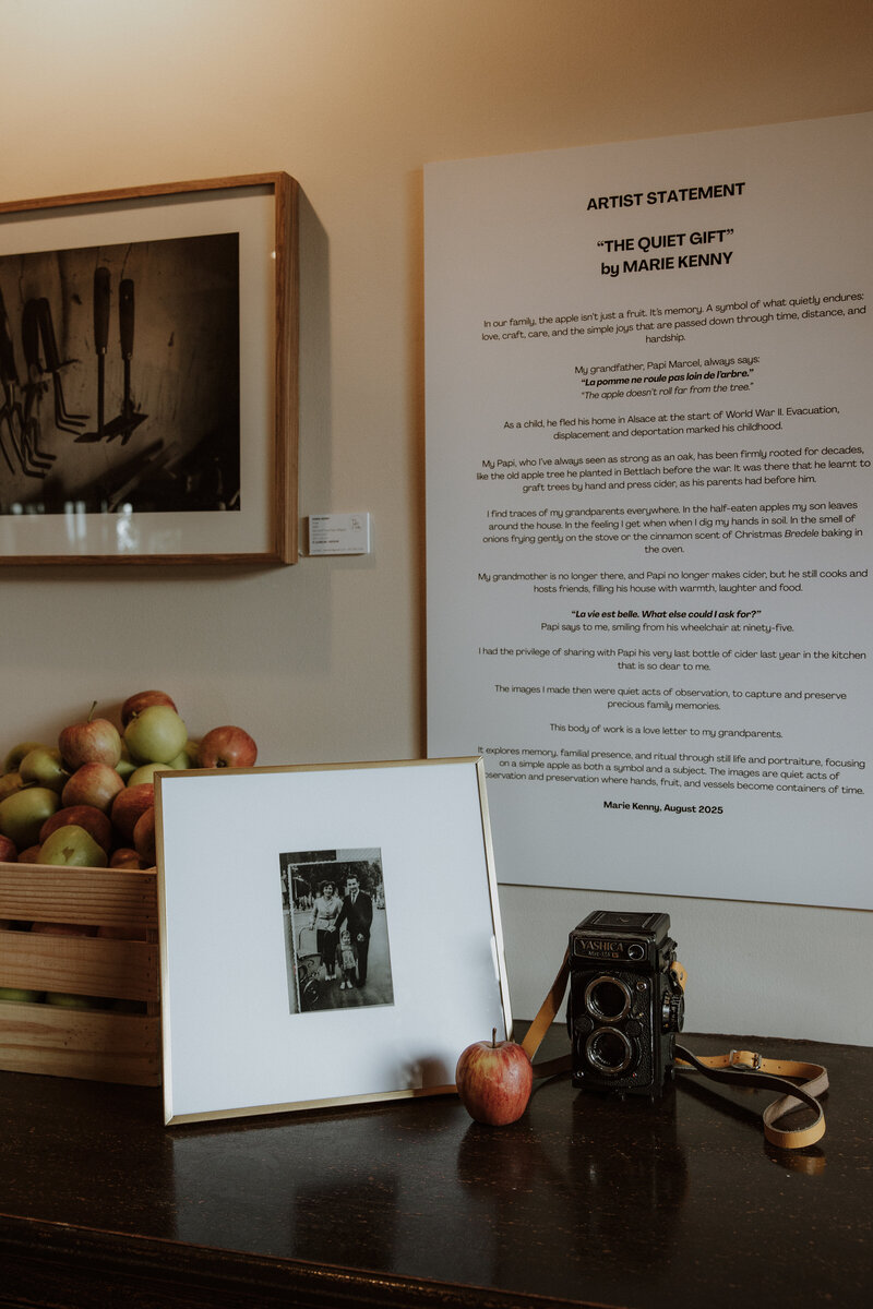 This work explores memory, familial resilience, and ritual through still life and portraiture, focusing on the apple as both a symbol and a subject, where hands, fruit, and vessels become containers of time. The work includes digital as well as film photographs, and different framing and printing techniques.